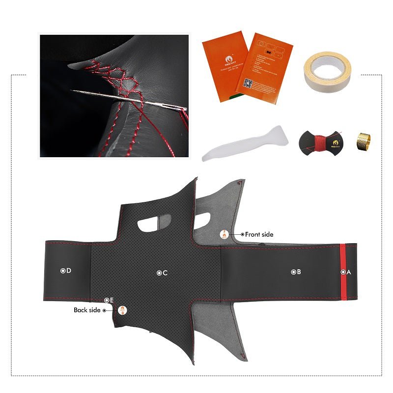 Alcantara nera + Alcantara traforata nera con strato rosso + striscia 3M + filo 3M
